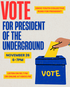 Cast your ballots! The Youth Collective gang holds a special election to decide, once and for all, who will get the great privileges and responsibilities of "President of the Youth Collective" (no privileges or responsibilities are associated with this title). The Youth Collective will face off in a series of spirited debates to decide who gets this incredibly important (honorary) position! Tune in on November 26th as they plead their case and cast your vote for who will sit in KBOO's oval office (they will not get an office). See you at the polls!